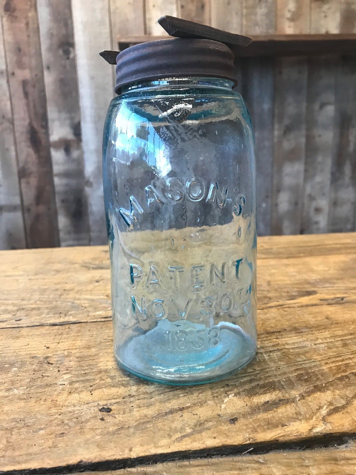 Title (ebay affiliate link): Antique Mason 1858 Fruit Jar with Hand Made Vintage Fly Trap Lid ~ Estate Find