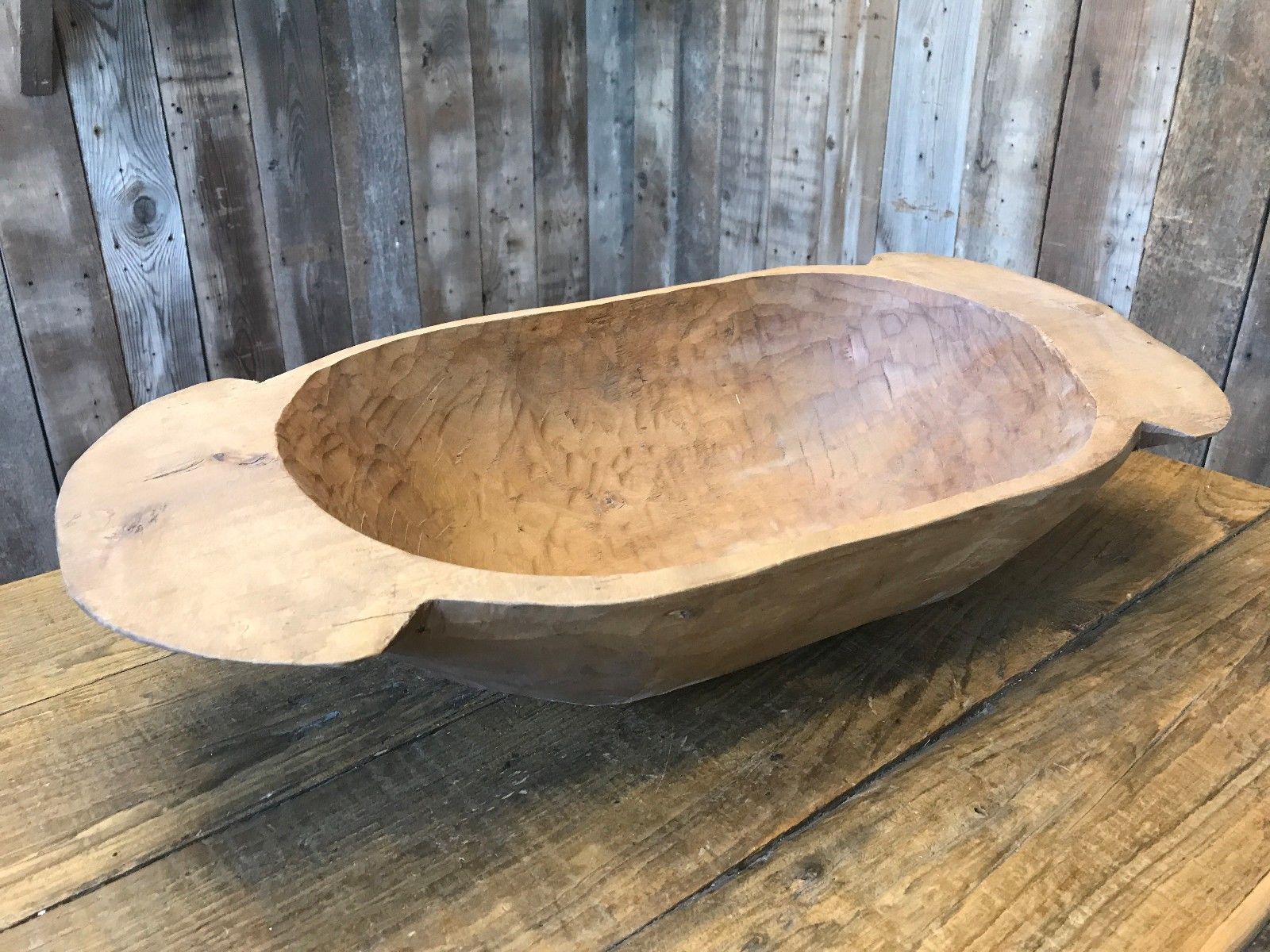Title (ebay affiliate link): Rustic Hand Carved Wooden French Loaf Bread Bowl / Dough Bowl ~ Vintage Kitchen