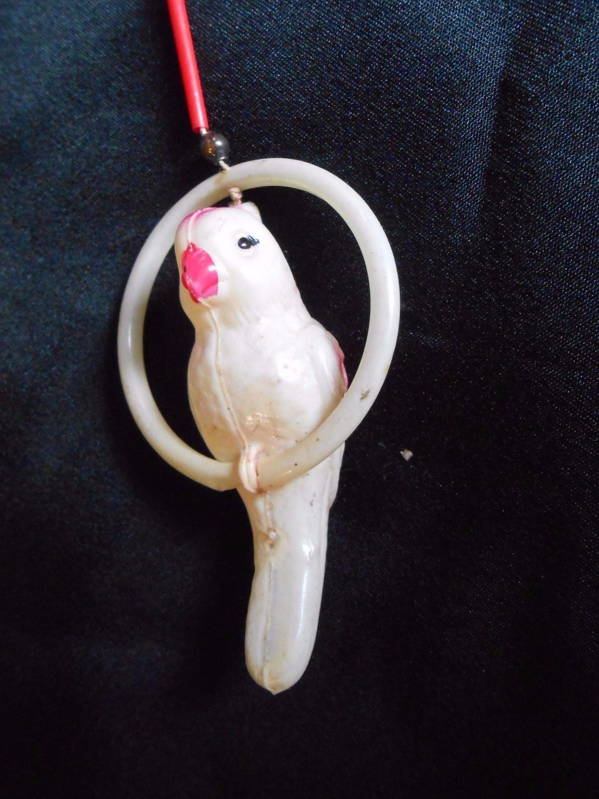 Title (ebay affiliate link): Vintage Celluloid Cockatoo - Parakeet or Parrot in a Ring Christmas Ornament?