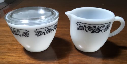 CORNING PYREX Corelle Old Town Blue Onion, Creamer Sugar w/ Lid set Milk Glass