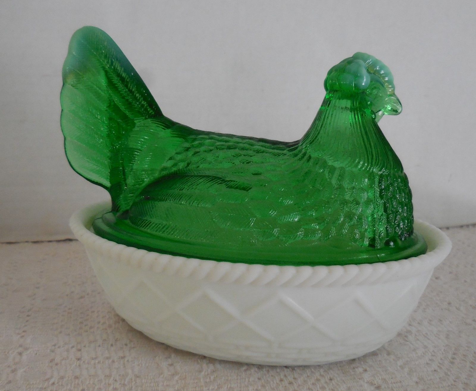 Title (ebay affiliate link): Vintage Westmoreland Glass Hen on Nest Green Over Milk Glass 7-1/2"L