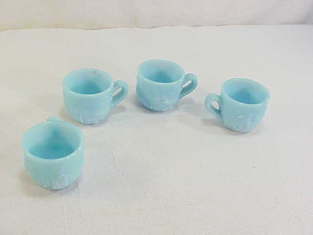 Title (ebay affiliate link): 4 Fabulous Antique Blue Milk Glass Little Red Riding Hood Childrens Cups Toy Dis