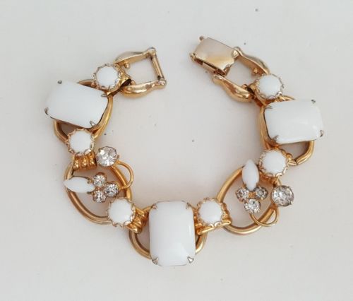 Title (ebay affiliate link): Juliana D&E White Milk Glass Clear Rhinestone Goldtone 7.25" Bracelet Unsigned