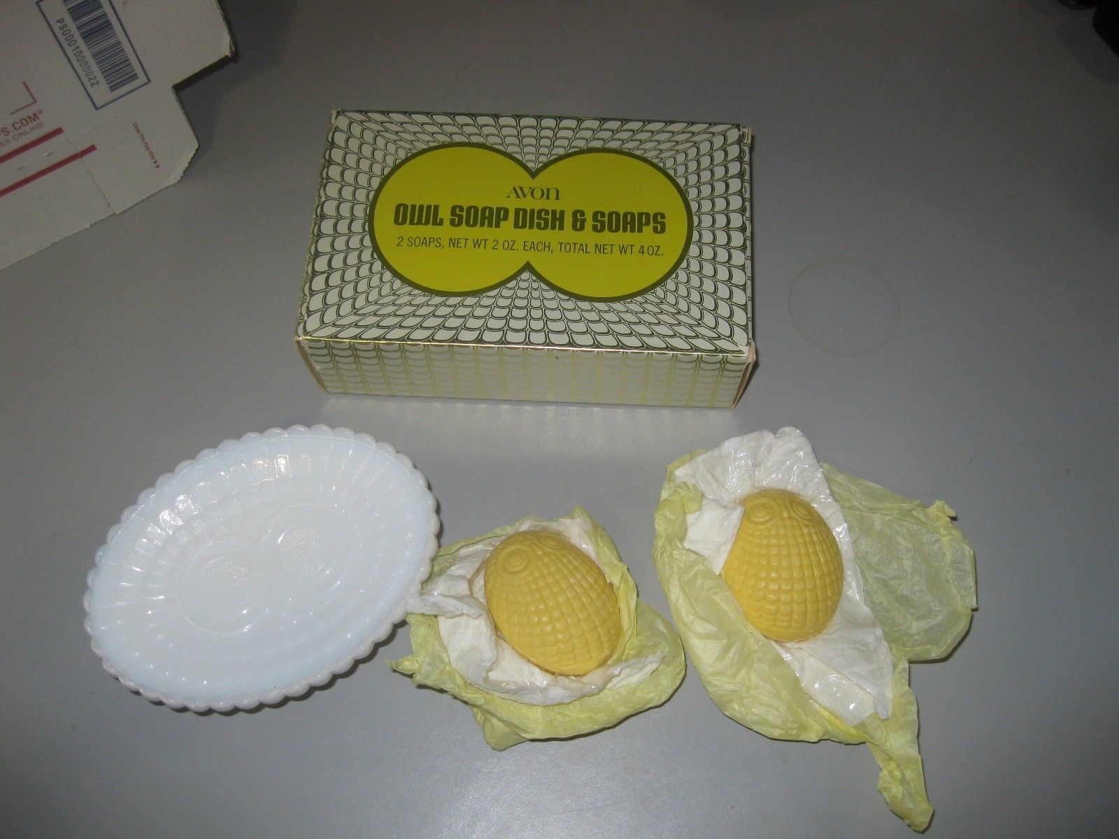 AVON OWL SOAP DISH & SOAPS MILK GLASS WHITE W 2 SOAPS NIB