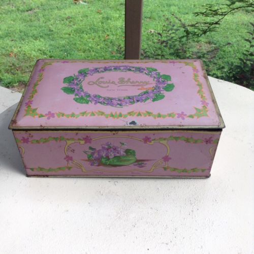 Title (ebay affiliate link): Vintage Louis Sherry Hinged Candy Box Tin Pink Purple New York Made By Canco