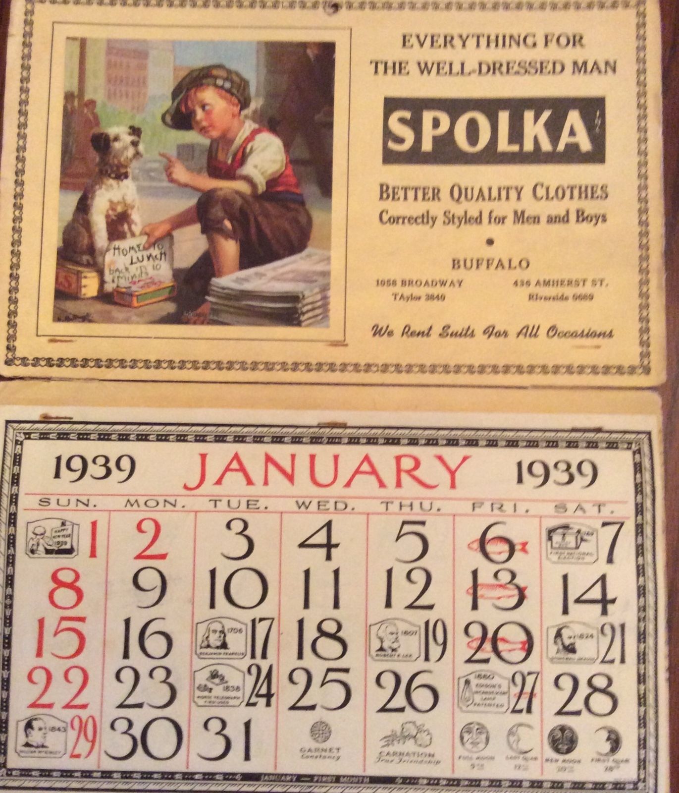 1939 Advertising Calendar, SPOLKA better quality clothing Buffalo, NY