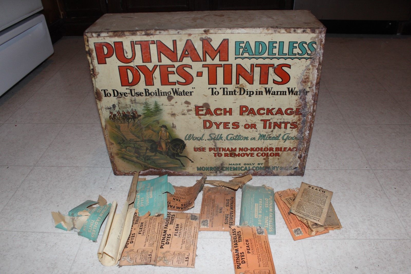 Vintage Putnam Fadeless Dyes Tin & Wood Cabinet Store Display Advertising