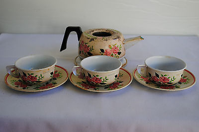 VINTAGE METAL TIN TEAPOT CUPS & SAUCERS MADE in JAPAN PINK ROSES