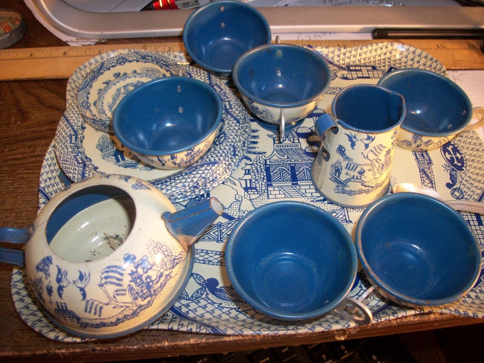 Vintage Childs Tin Litho Blue Willow Tea Set Dishes 25 pieces/tray, creamer etc