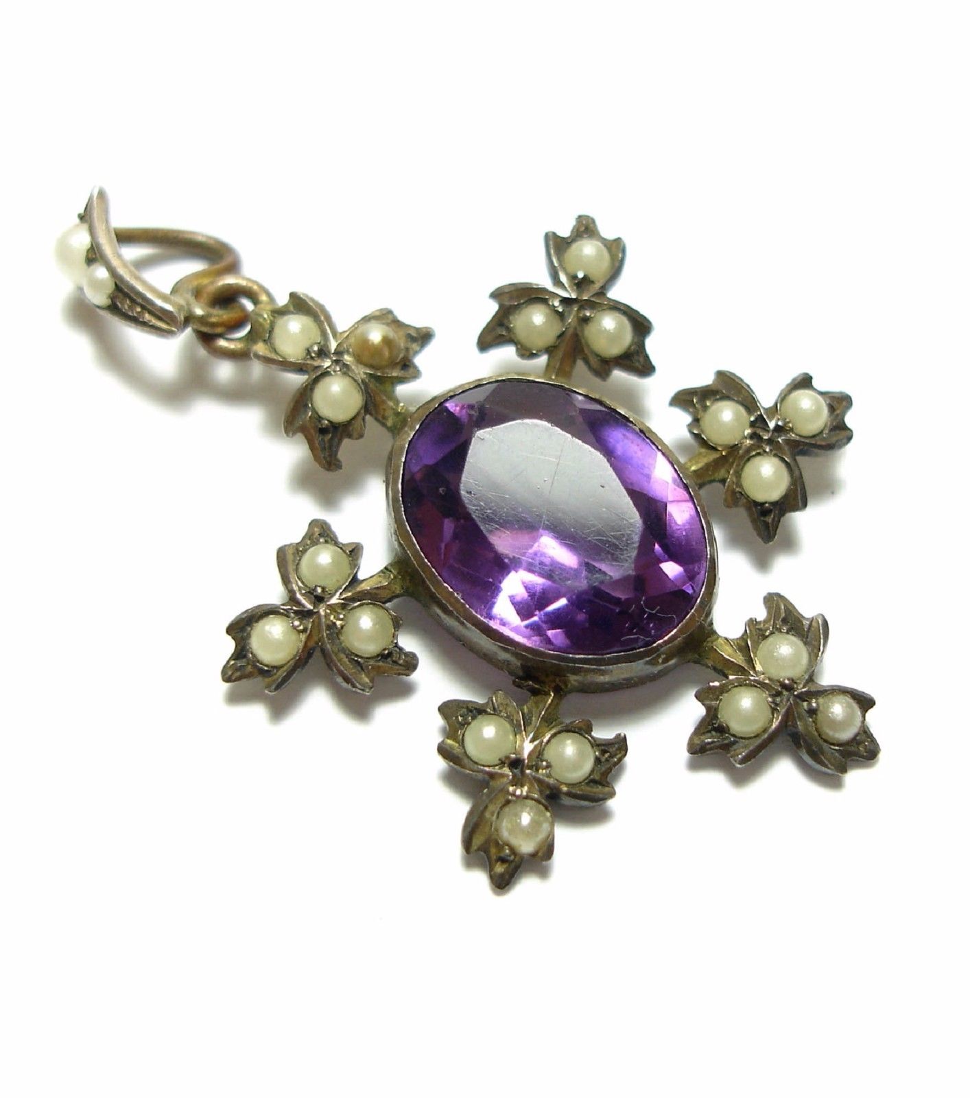 Title (ebay affiliate link): BEAUTIFUL OLD ANTIQUE VICTORIAN SEED PEARL & AMETHYST GLASS ORNATE PENDANT (A17)