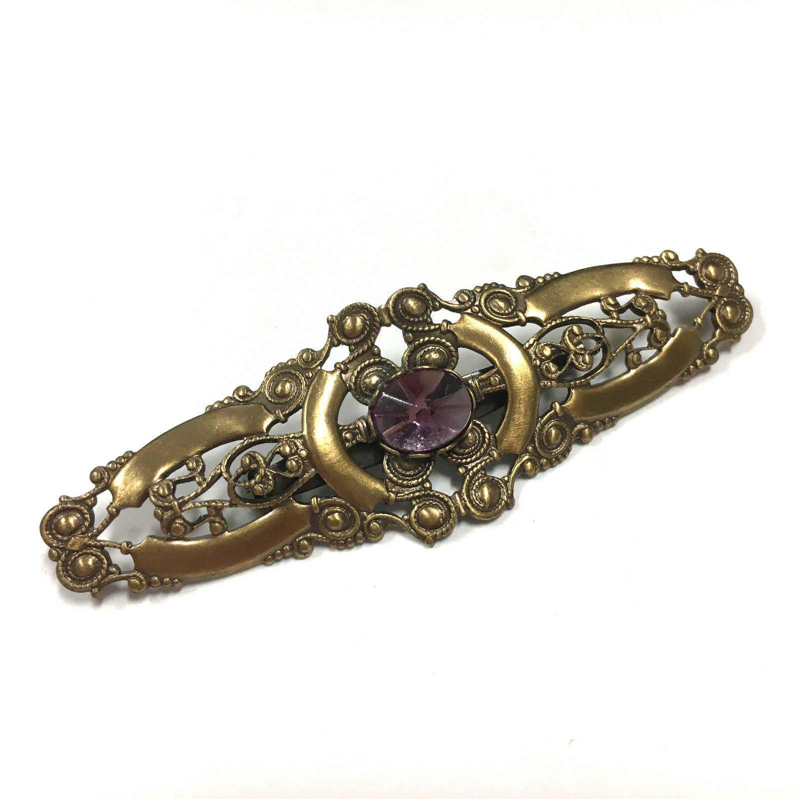Title (ebay affiliate link): VTG Purple Amethyst RIVOLI REPOUSSE VICTORIAN Style Bar Pin Antique Gold H349i