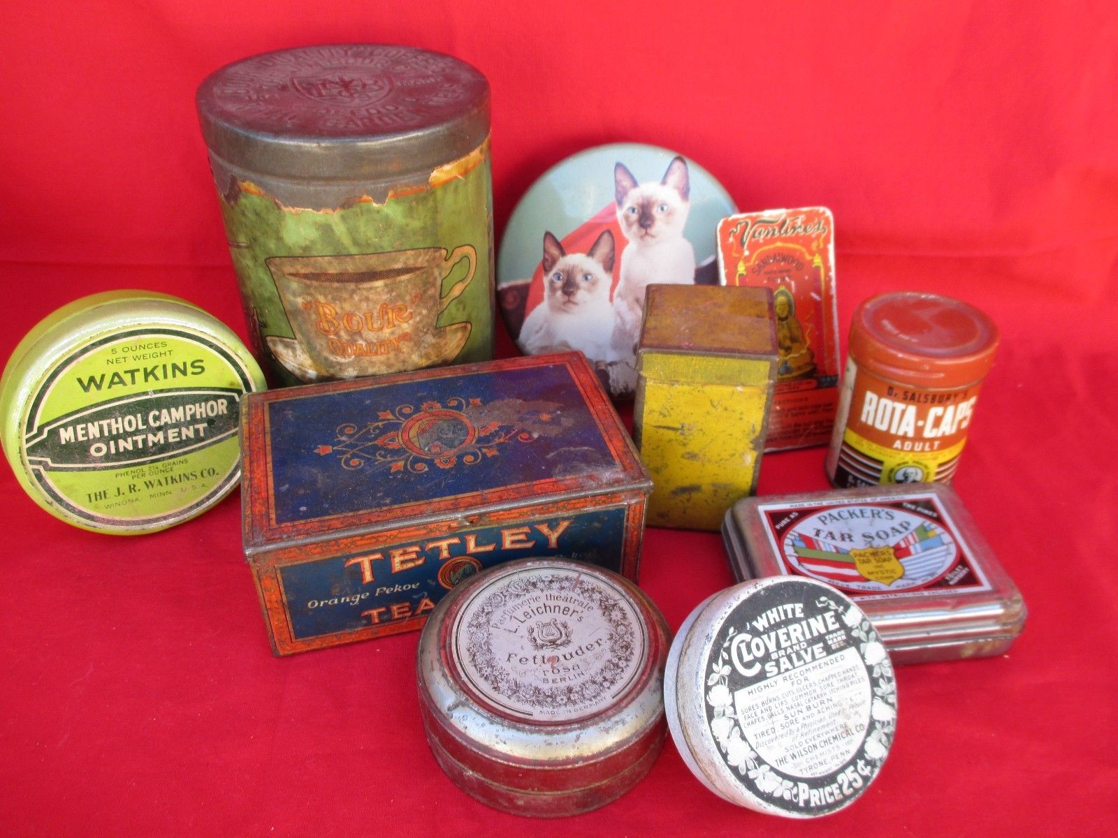 Title (ebay affiliate link): Vintage Lot of 10 Advertising Tins, Coffee, Ointment, Soap, Tea etc.