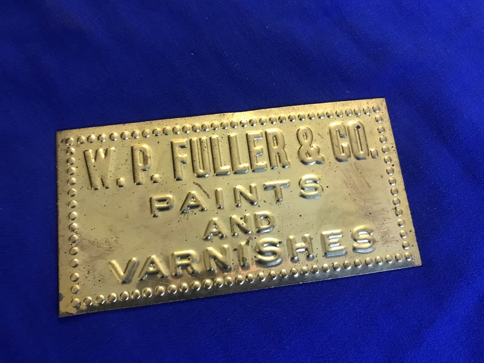 Antique 1890s FULLER PAINTS & VARNISH Embossed Metal Tacker Sign