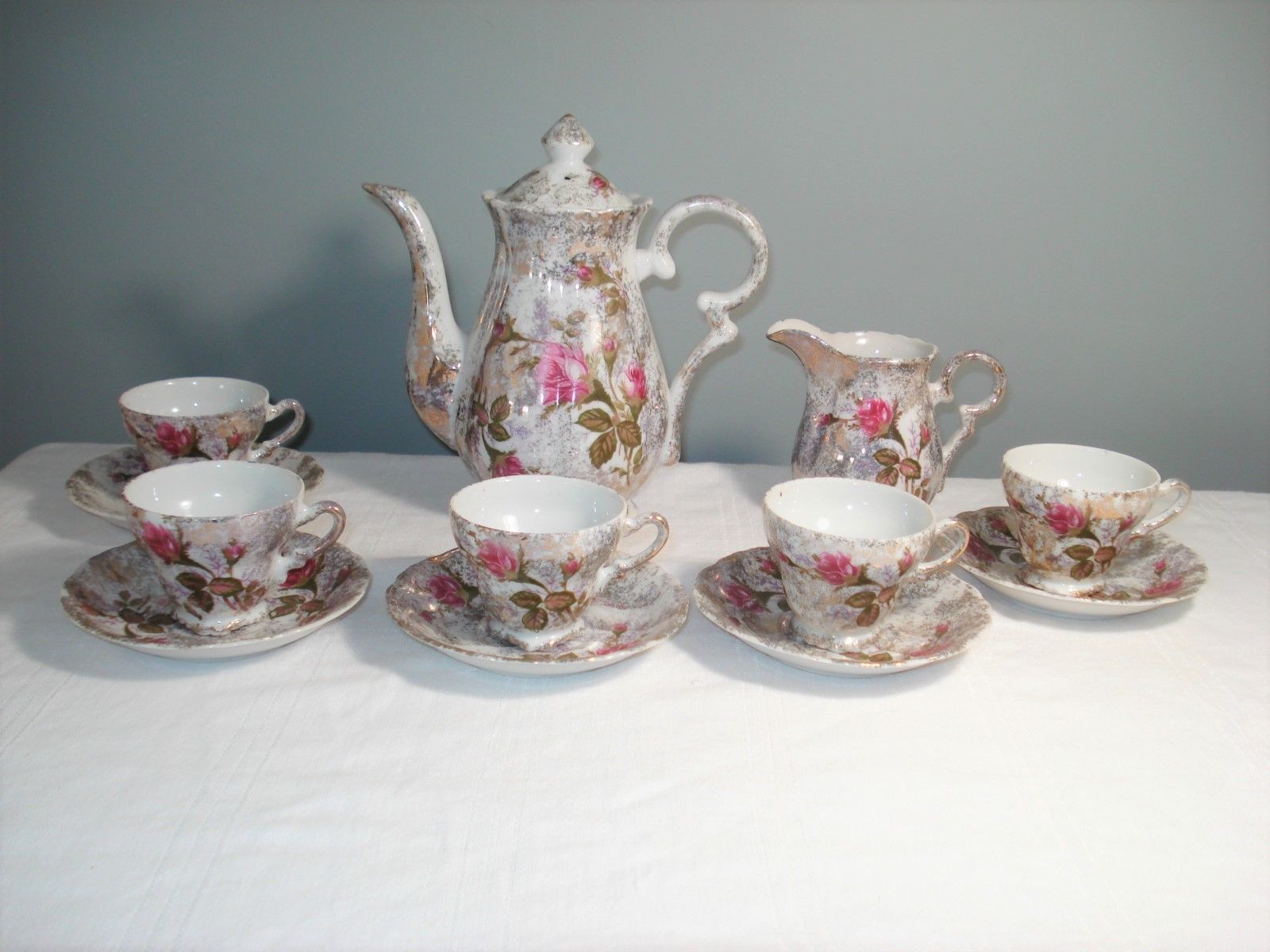 Title (ebay affiliate link): Vintage Porcelain Teapot Set Creamer Cups Saucers Hand Painted Pink Rose Tea Pot