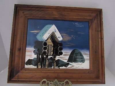 MATTHEW ADAMS Alaska Food Cache Scene Painted Ceramic Tile Framed Mid 20th Cent.