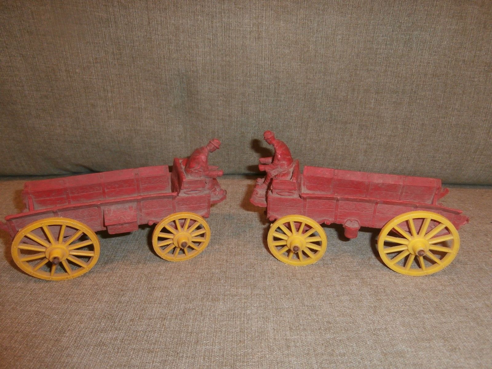 Title (ebay affiliate link): Set of 2 Auburn Red Rubber Wagons 5.5" Long with Driver & Yellow Plastic Wheels