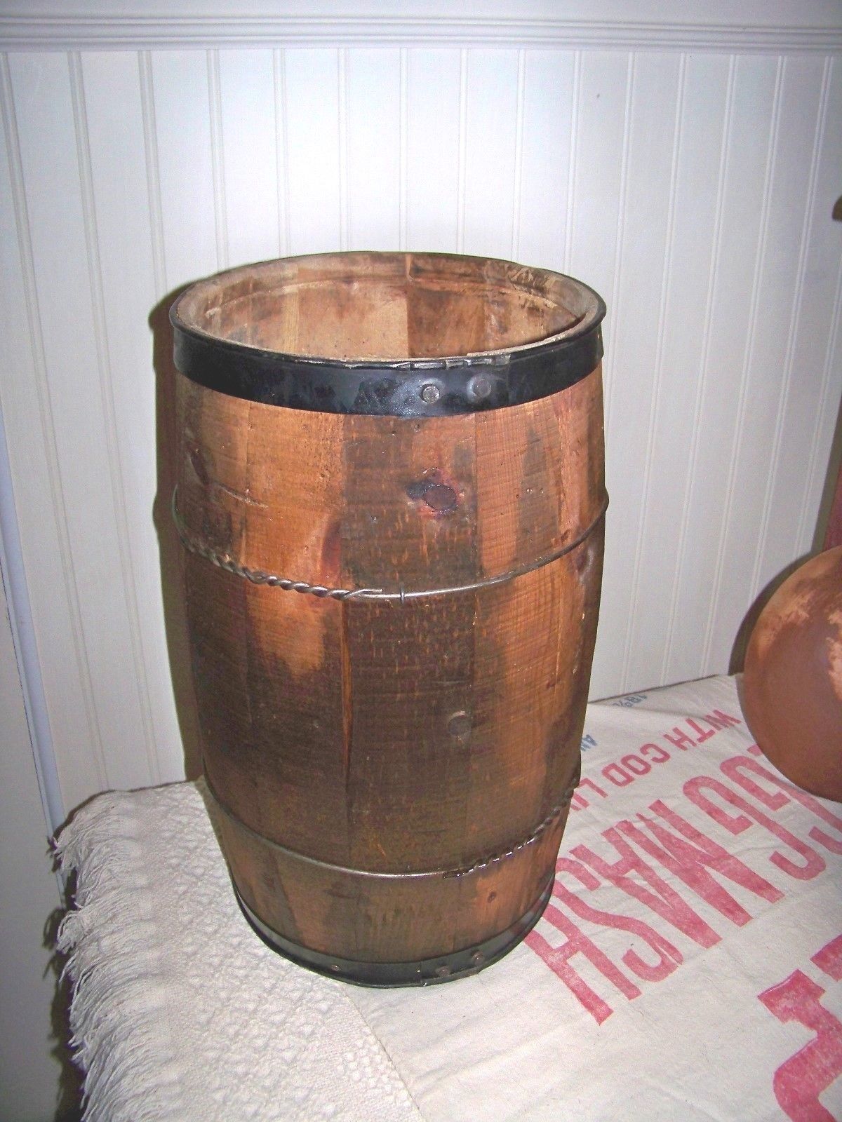 Title (ebay affiliate link): Primitive Cedar Barrel with Black Metal & Wire Bands