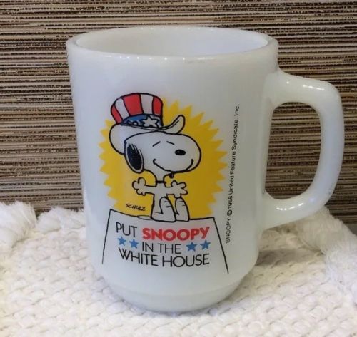 Title (ebay affiliate link): HOCKING FIRE KING "PUT SNOOPY IN THE WHITE HOUSE" COFFEE MUG MILK GLASS CUP 1980