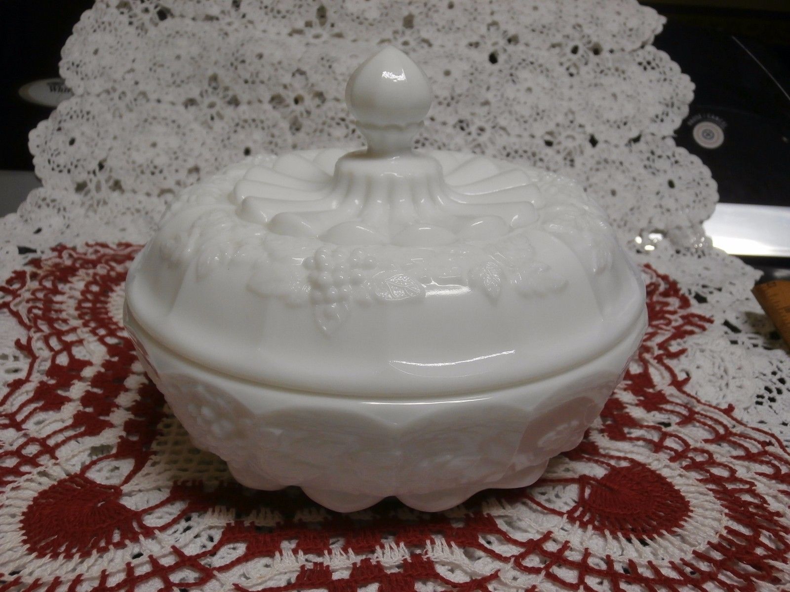 Title (ebay affiliate link): Large Vintage Westmoreland Milk Glass Covered Candy Dish Paneled Grape~Marked WG