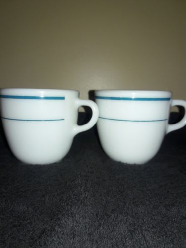 Title (ebay affiliate link): Pyrex Diner Style Milk Glass Coffee Cups Mugs w/ teal blue stripes Vintage