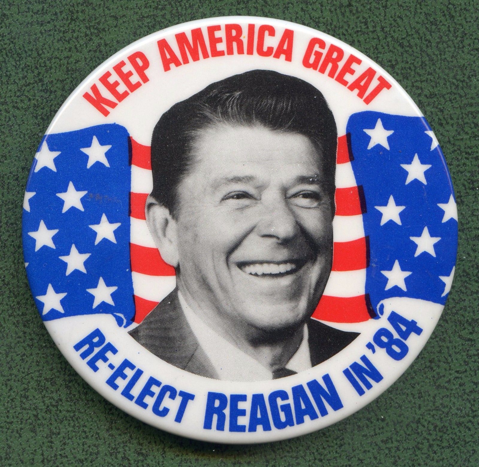 Title (ebay affiliate link): Large 1984" Keep America Great - Re-Elect Ronald Reagan in ''84" - 3" button