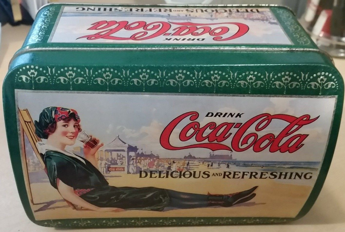 Title (ebay affiliate link): 1994 Coca Cola Metal Vintage Calendar Girl Green Tin