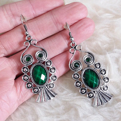 Title (ebay affiliate link): Vintage Womens Antique-Silver Color Green Beads Owl Charms Dangle Hook Earrings