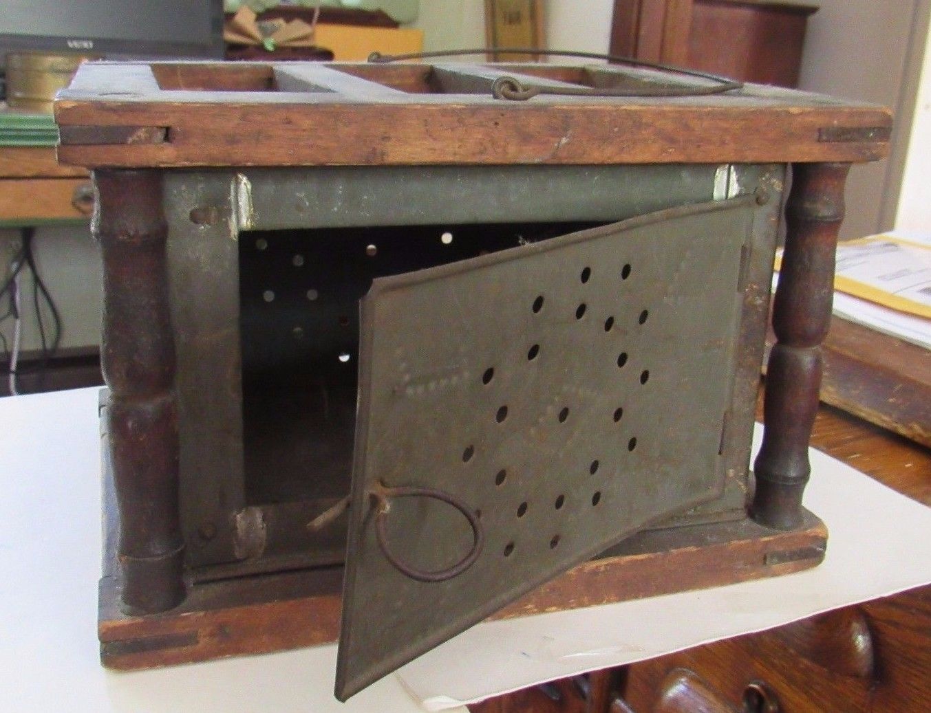 Title (ebay affiliate link): Antique handled, pierced tin and wood foot warmer