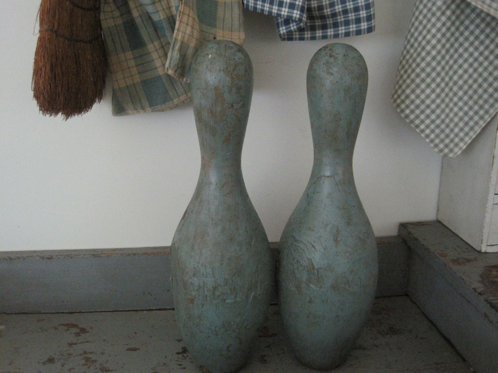 Title (ebay affiliate link): TWO Old Primitive BLUE PAINT Wood Exercise Clubs in the shape of Bowling Pins