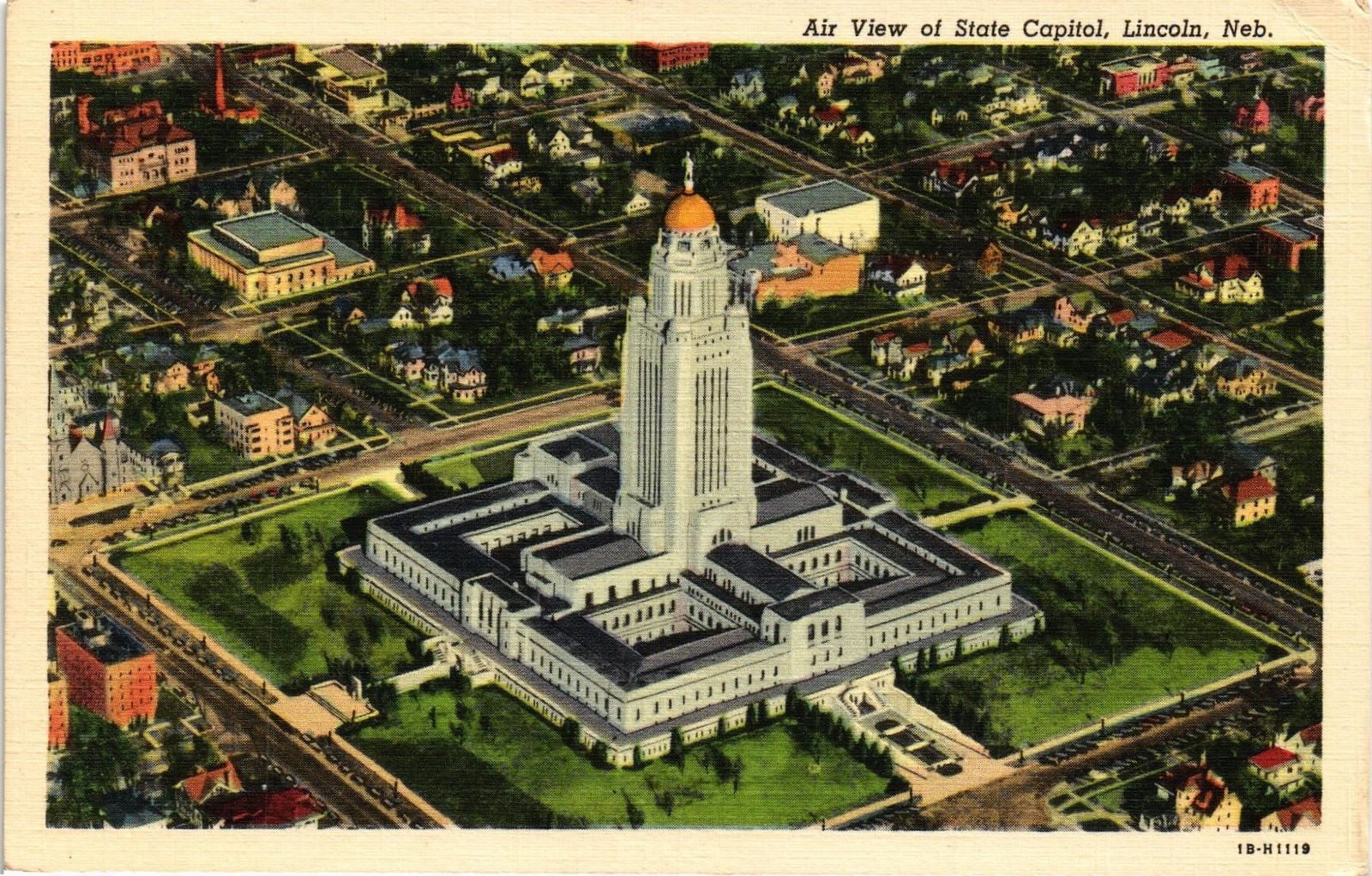 DR JIM STAMPS US POSTCARD AERIAL VIEW OF STATE CAPITOL LINCOLN NEBRASKA LINEN