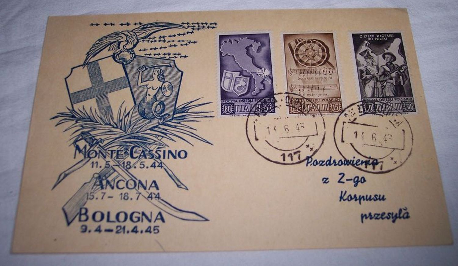 World War II Poland postcard Polish stamps battles Italy Monte Cassino Bologna