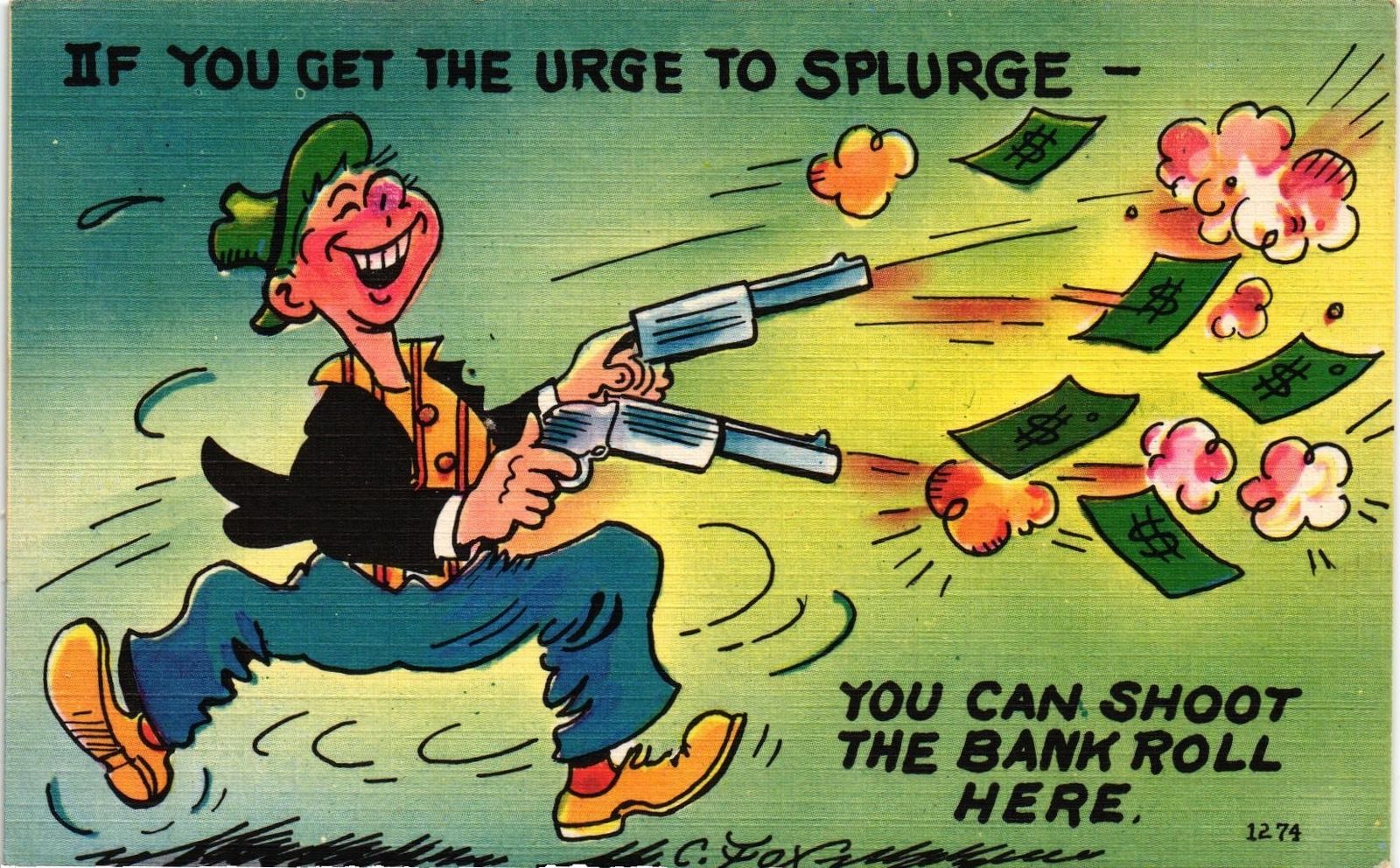 Title (ebay affiliate link): DR JIM STAMPS US POSTCARD HUMOR MAN SHOOTING MONEY LINEN
