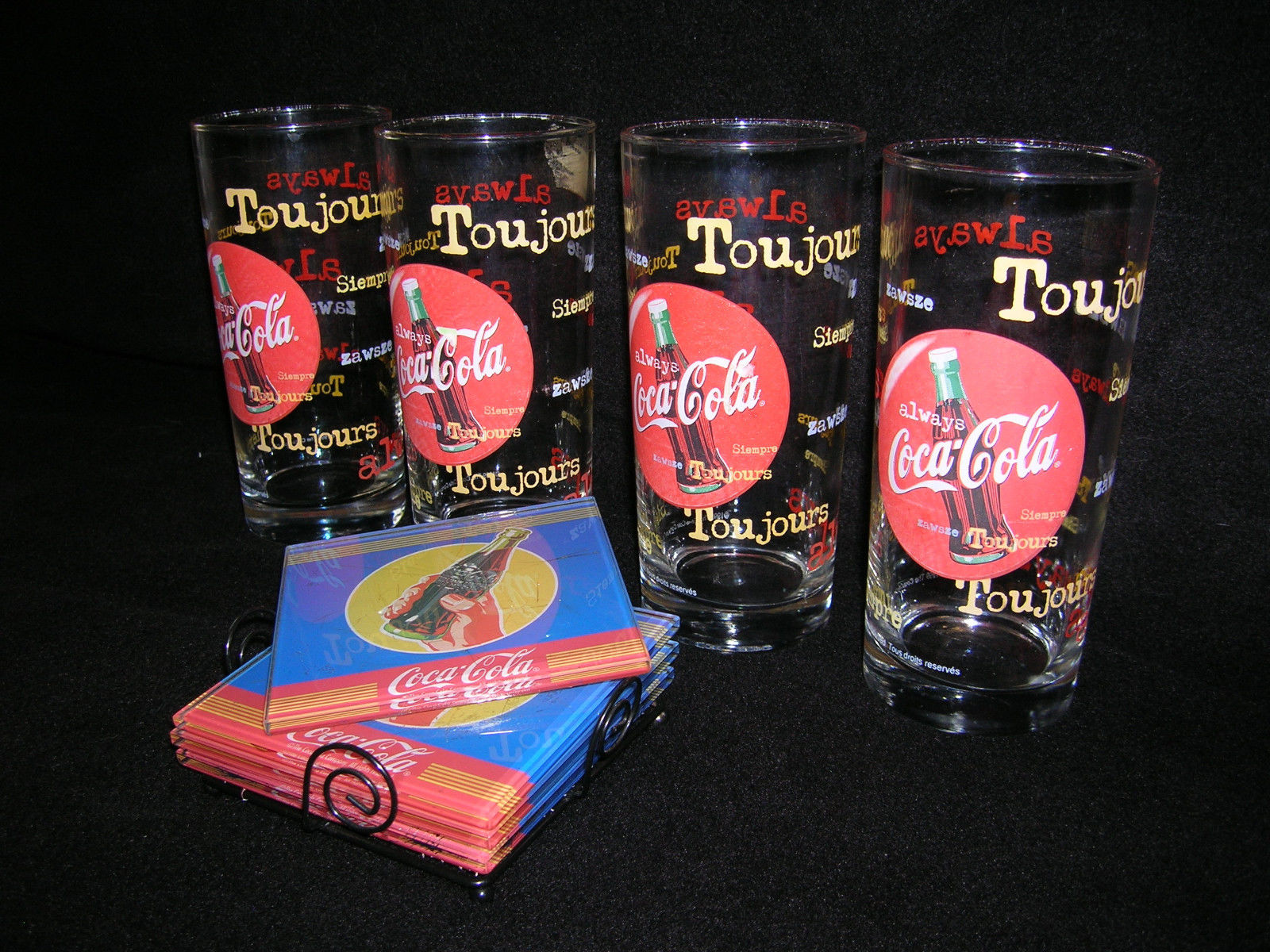 Title (ebay affiliate link): Lot of 4 1999 Coke Glasses and 4 glass coasters with stand.