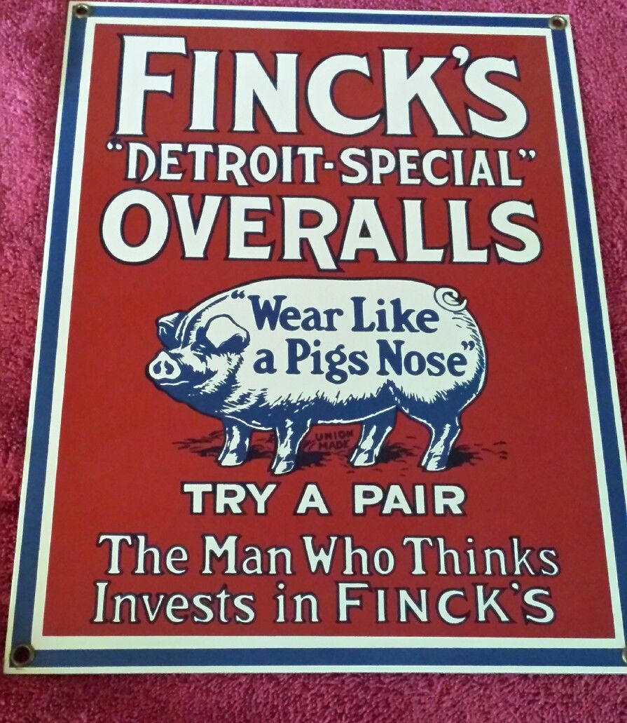 vintage ande rooney Finck''s Detroit Special Overalls Porcelain Enamel Metal Sign