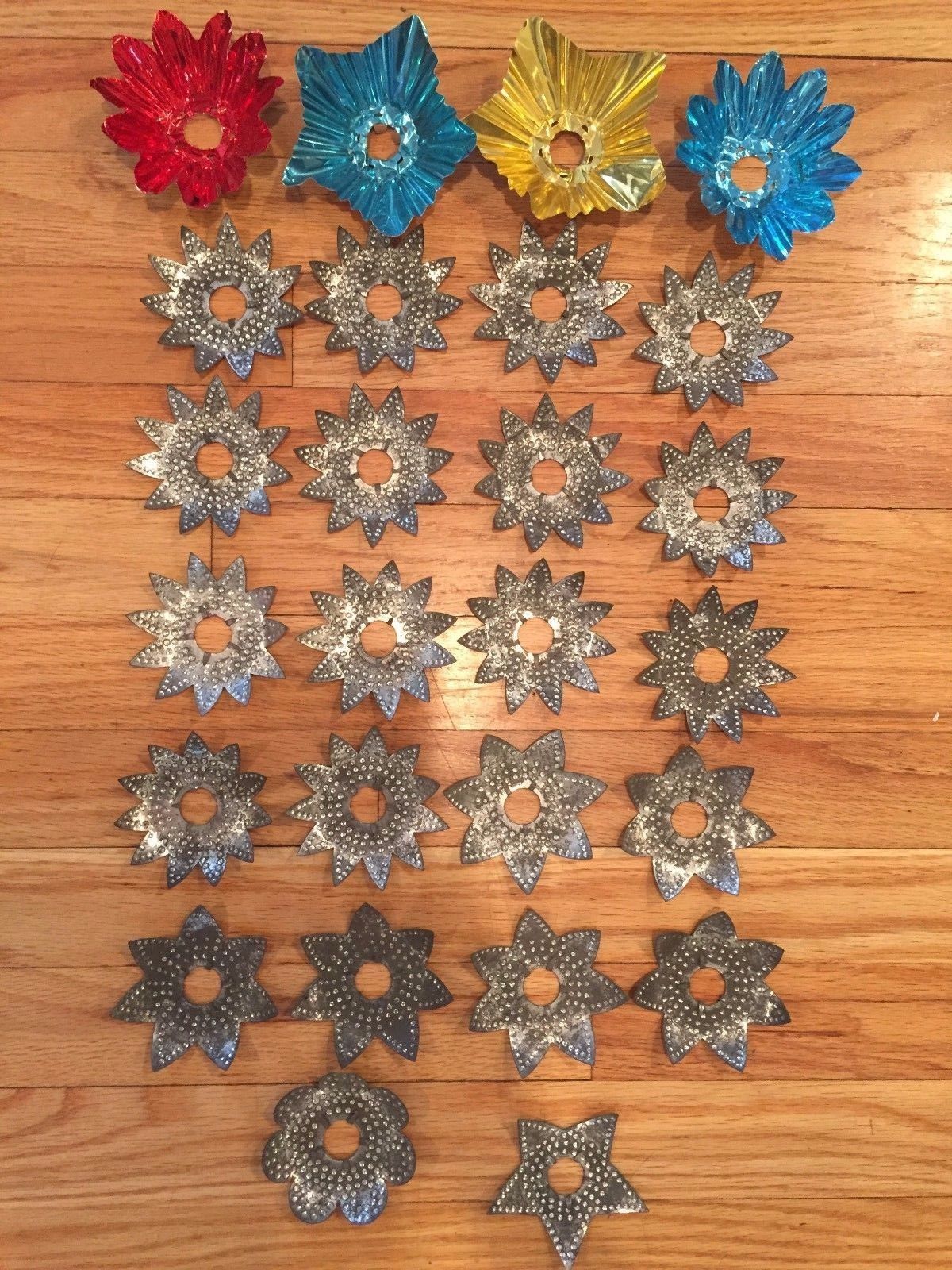 Title (ebay affiliate link): Lot of 26 Vintage Christmas Tree Punched Tin Candle Light Reflectors Antique