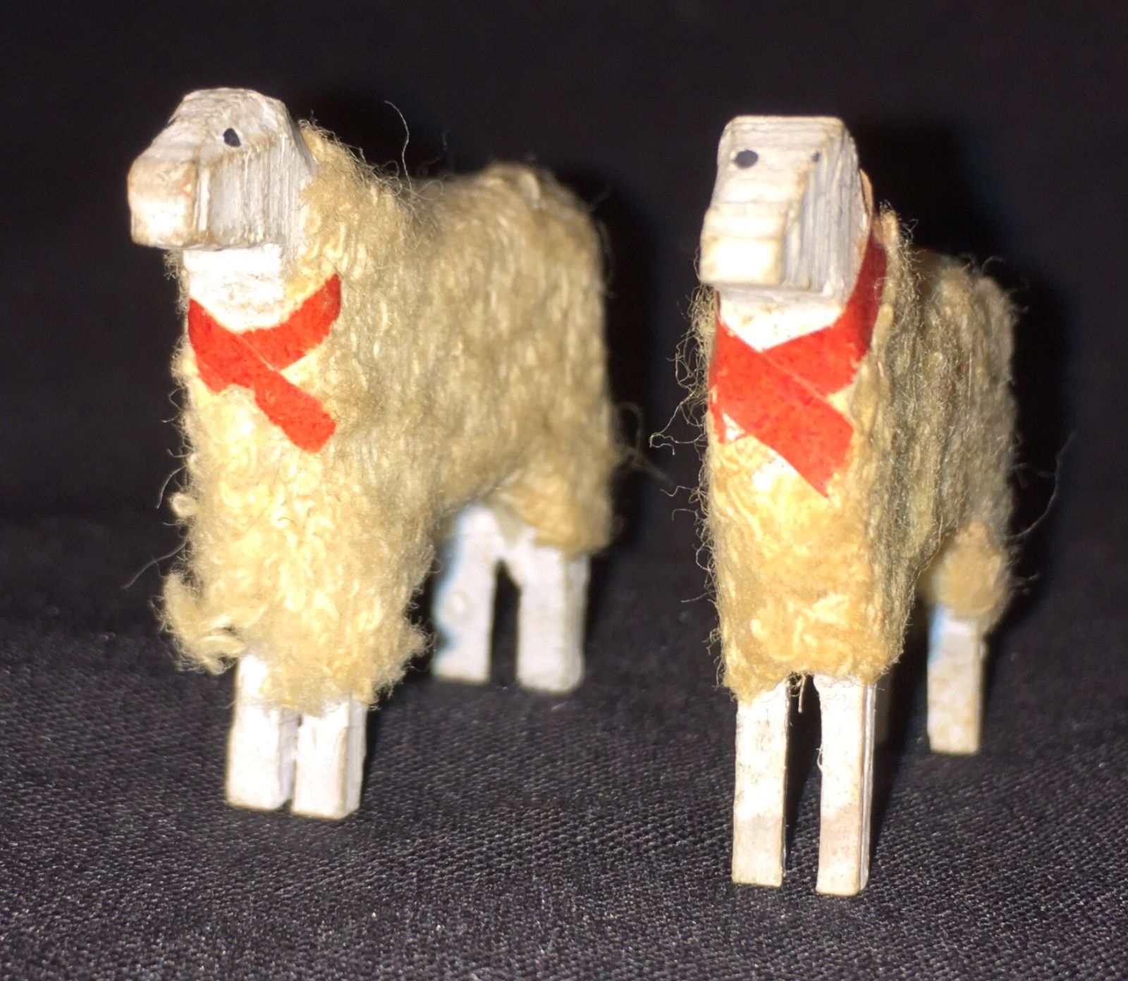 PAIR OF ANTIQUE GERMAN ERZGEBIRGE TINY WOOLY PUTZ SHEEP STICK LEGS