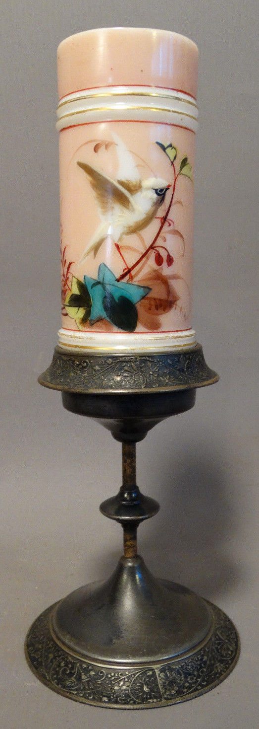19thC Antique VICTORIAN Floral BIRD on BRANCH PAINTING on BRISTOL GLASS Bud VASE