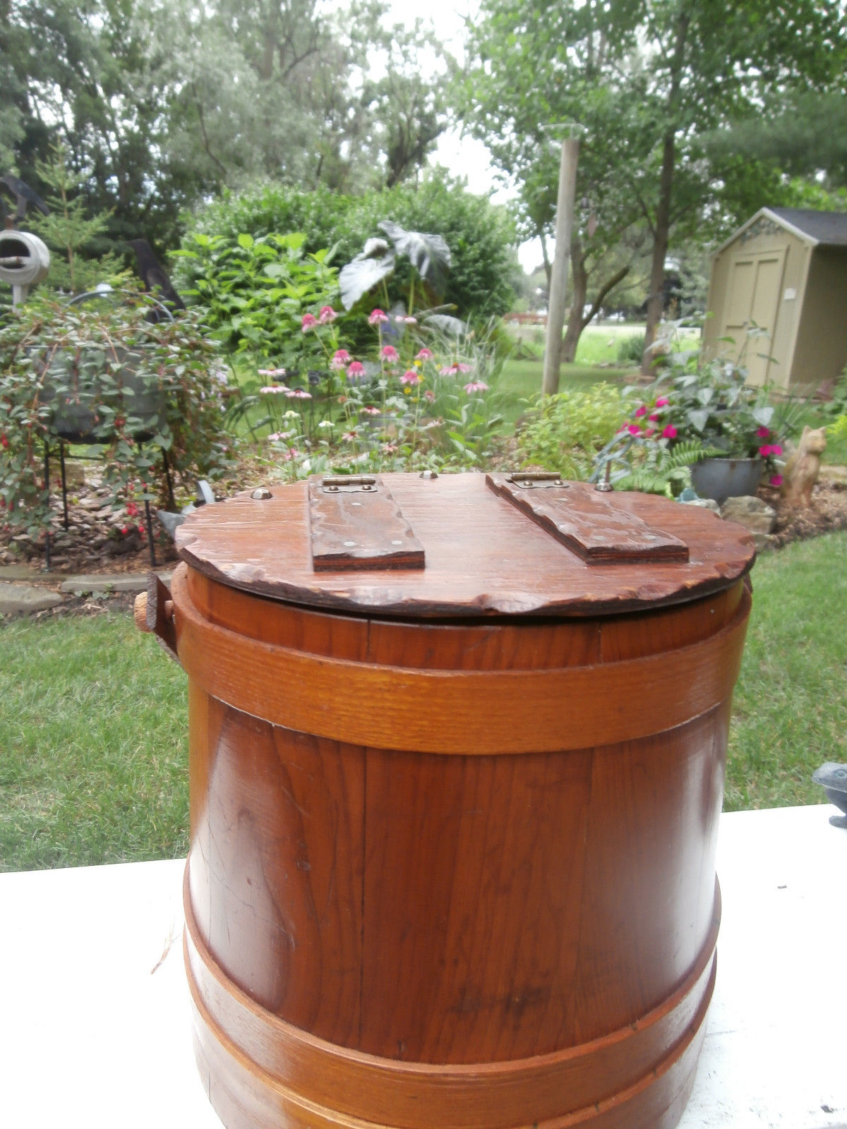 Title (ebay affiliate link): VINTAGE~OLD~PRIMITIVE~RUSTIC~COUNTRY~WOOD FIRKIN w/HINGED LID~SWING HANDLE~NICE!