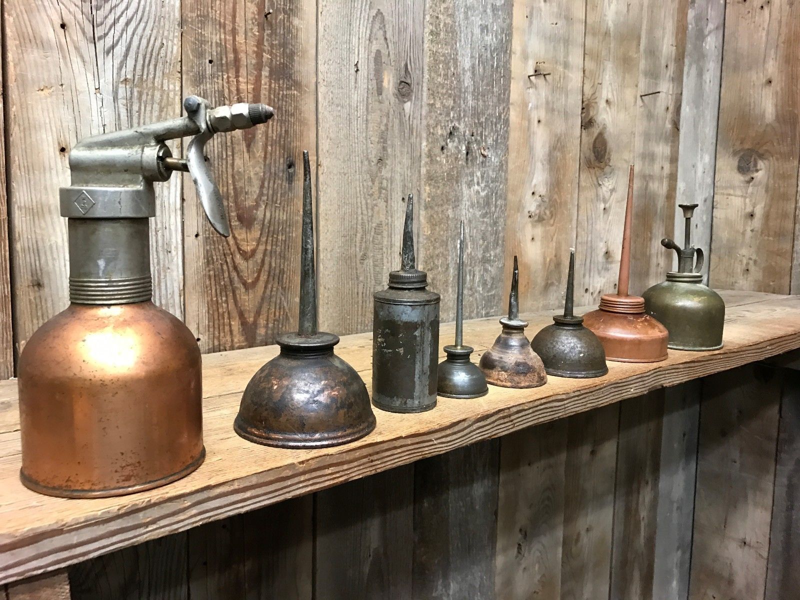 Title (ebay affiliate link): 8 Antique & Old Vintage Oil Pumper Cans ~ No Holes / Leaks ~ Barn Find Tools