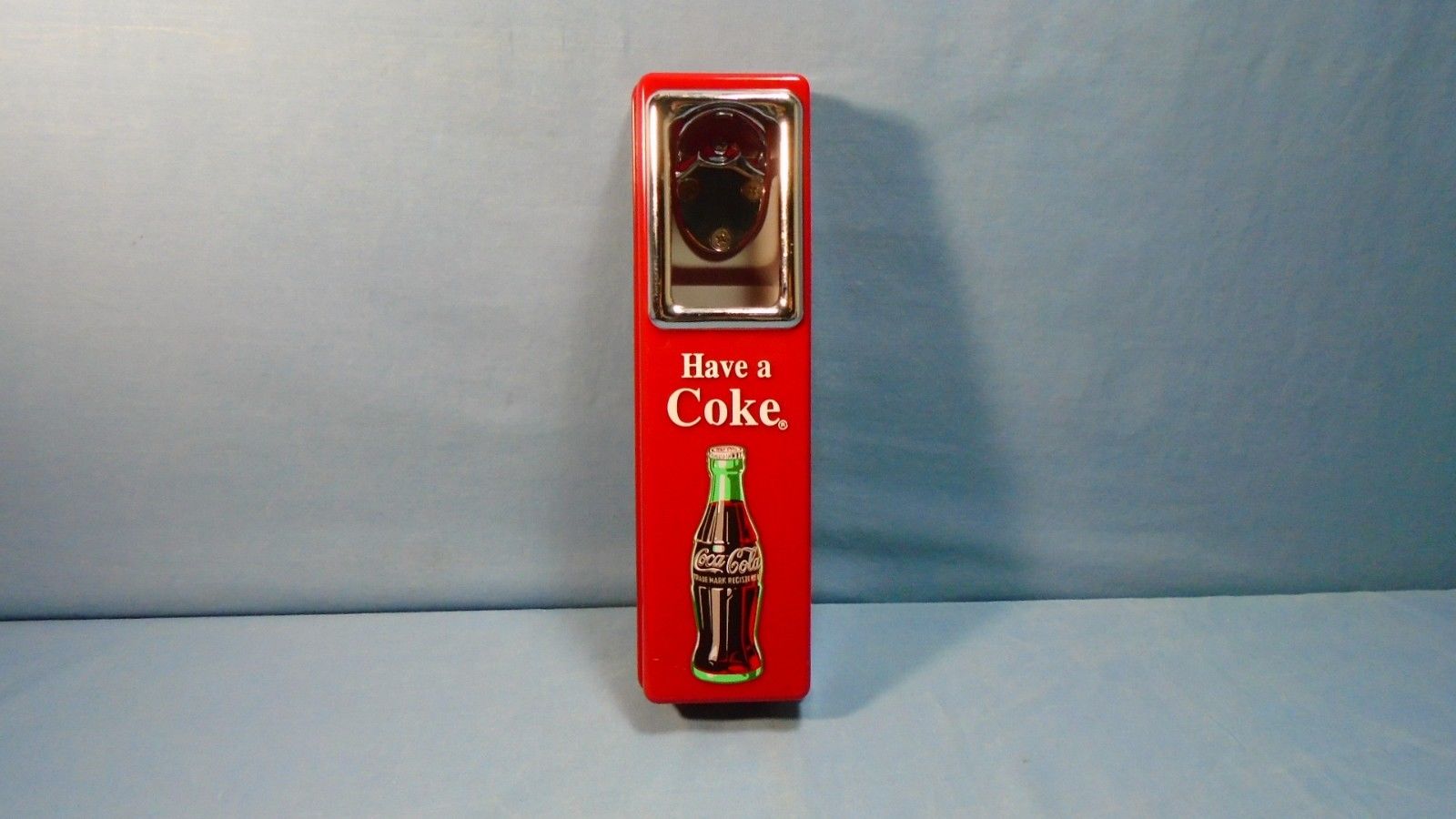 Title (ebay affiliate link): 1997 Coca Cola Brand Bottle Opener and Cap Catcher Wall Mount Retro Red