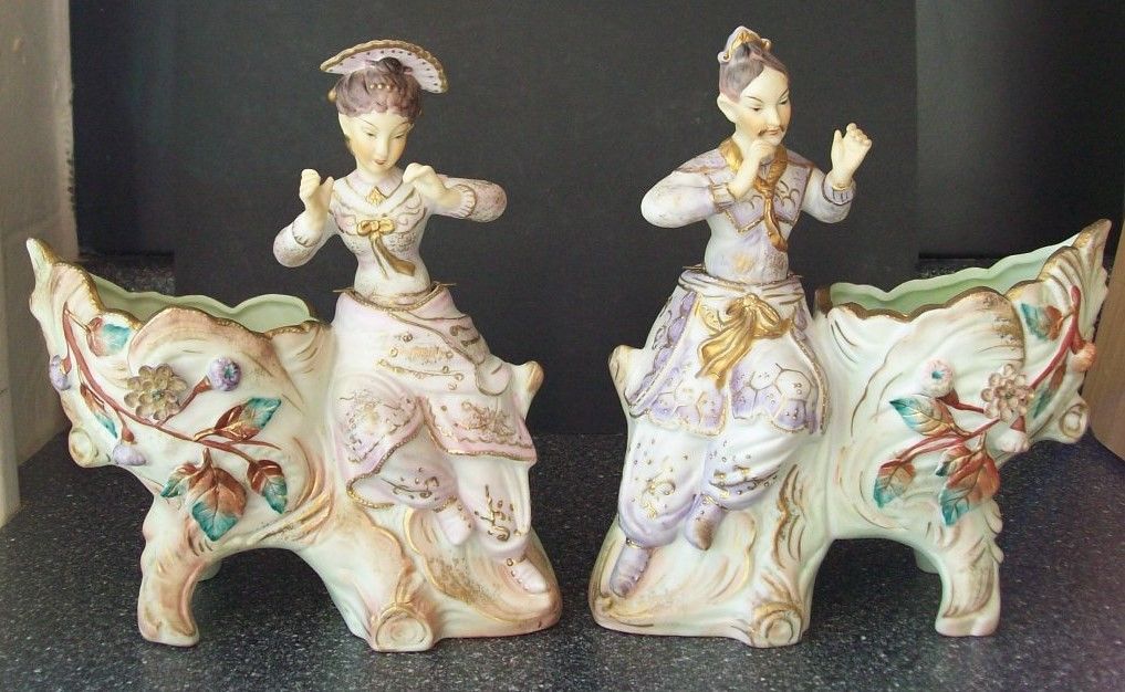 Title (ebay affiliate link): 2 BISQUE PORCELAIN JAPANESE NODDING PLANTERS Male/Female PINK, PURPLE, GOLD rare