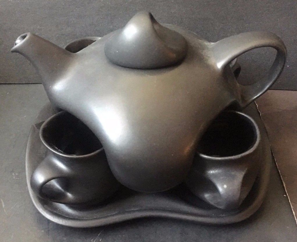 MODERN TEA POT Black Abstract 6pc Pottery Set PETER SAENGER Tray Cups V294 GP