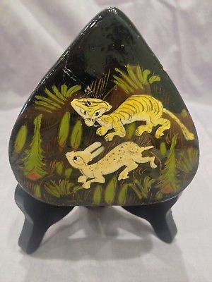 Title (ebay affiliate link): VINTAGE KASHMIR INDIA BLACK LACQUERED HEART SHAPED TRINKET BOX