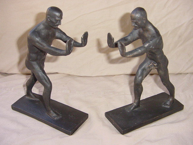 Title (ebay affiliate link): Pair of NUDE MAN IRON BOOKENDS Naked Men Holding the Books Up with Leaf Covering