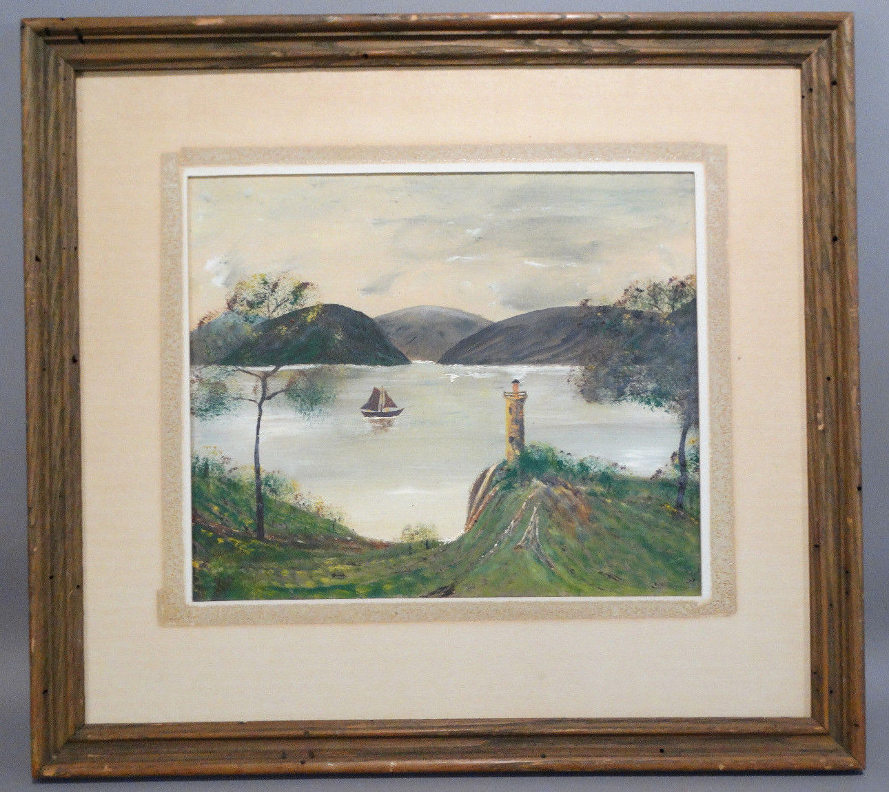 Title (ebay affiliate link): Antique PRIMITIVE HRV Style RIVER VALLEY Old LIGHTHOUSE & SAILBOAT PAINTING