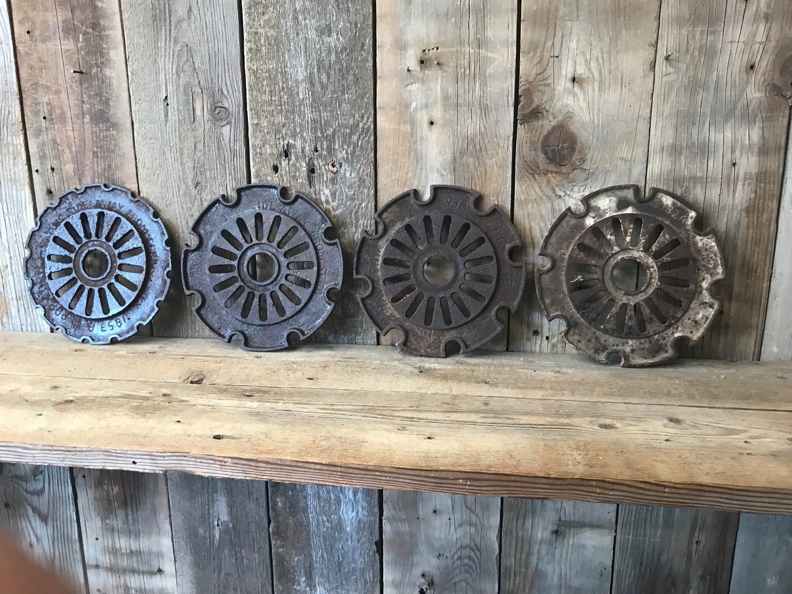 4 Antique Cast Iron Seed Corn Planter Plates / Wheels ~ Vintage Primitive Farm