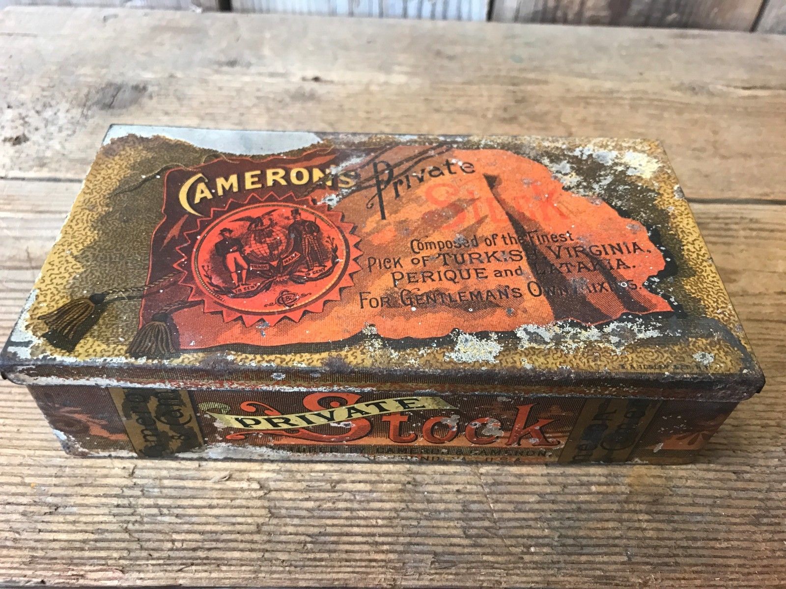 Title (ebay affiliate link): Antique 1800s Camerons Private Stock Tin Metal Cigar or Tobacco Box Rare Vintage
