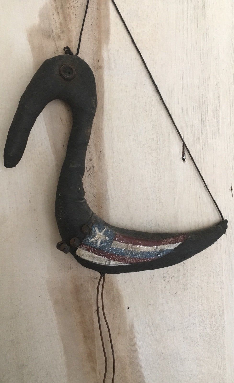 primitive crow w stripe glittered wings-Rusty bell necklace by erikascupboard
