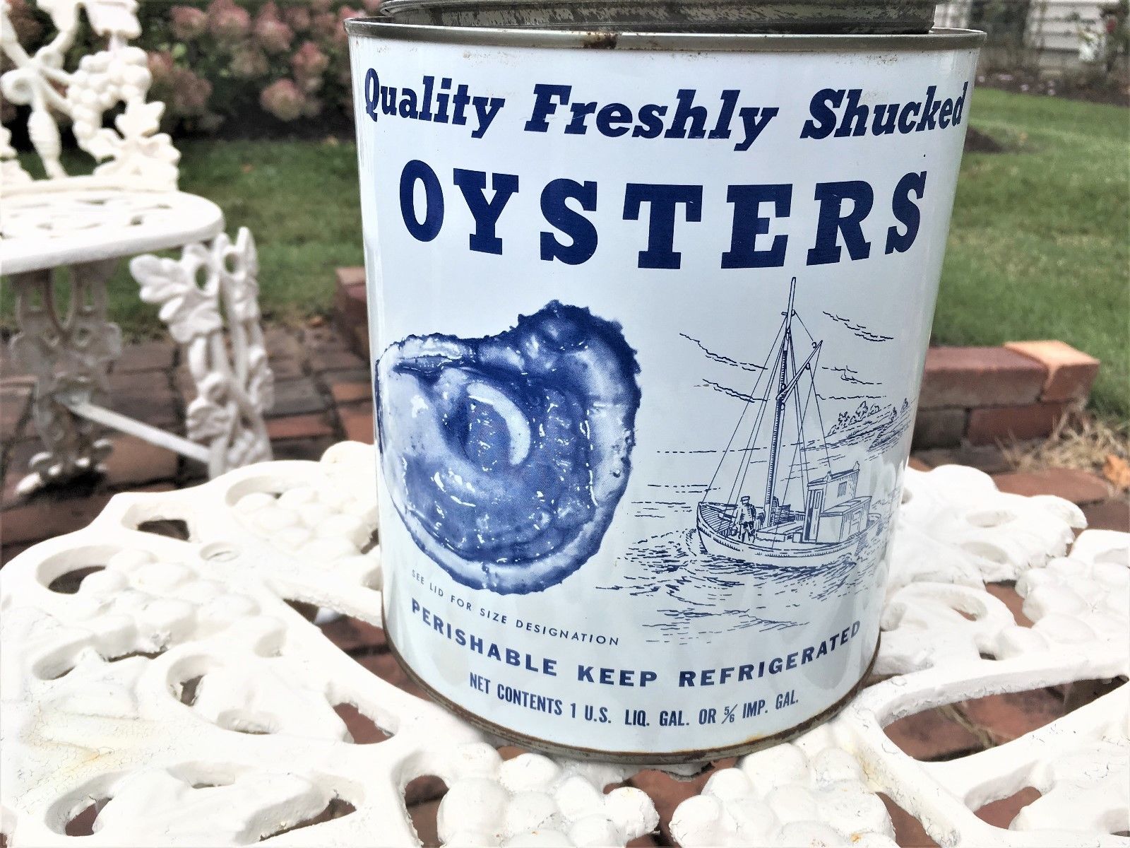 Title (ebay affiliate link): Vintage 1 Gal. Quality Freshly Shucked Brand Oysters Tin Can Reed Chincoteague V