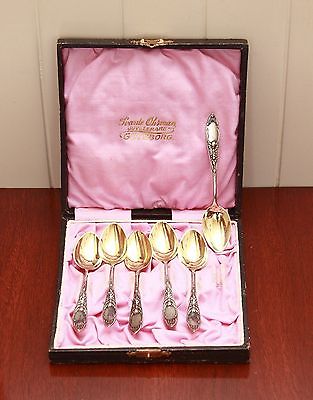 Beautiful Set of 6 Antique Silverplated & Gilded Coffee/Mocha Spoons Boxed 1900s